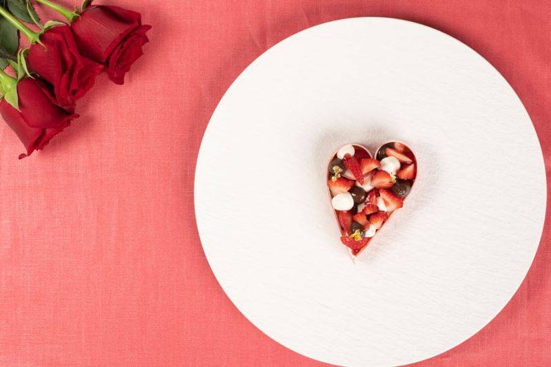 Legen Sie das CARMA® Ruby Rubina 40% Schokoladenherz in die Mitte des Tellers. Portionieren Sie das CARMA® Ruby Rubina 40% Randen-Mousse in die Herzdekoration. Die geviertelten Erdbeeren darauf verteilen. Etwas Himbeergelee, CARMA® White Nuit Blanche 37% Vanille Crémeux und CARMA® Dark Edelbitter 70% Crémeux zwischen den frischen Früchten harmonisch verteilen. Zum Schluss das Dessert mit Blattgold und Baiser verzieren.