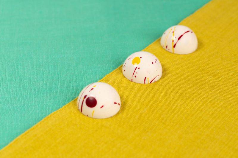 Die Formen für das Design vorbereiten, indem Sie mit Hilfe eines kleinen Pinsels Linien und Punkte mit vorkristallisierter roter und gelber Kakaobutter herstellen. Sobald die Kakaobutter ausgehärtet ist, vorkristallisierte CARMA® Couverture White Nuit Blanche 37% in die Form giessen, um die hohlen Schalen herzustellen. Vollständig aushärten lassen, bevor Sie einen kleinen Tropfen des Mango-Gels einfüllen. Den Rest der Praline mit der 37% Joghurt-Ganache CARMA® Couverture White Nuit Blanche füllen. Vor dem Schliessen ca. 8 Stunden kristallisieren lassen. Die Formen für ca. 10 Minuten in den Kühlschrank geben und sofort entformen.