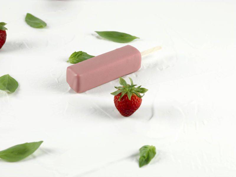 Milch, Rahm, Zucker und Glukose aufkochen. Basilikum zufügen und ca. 30 Min. ziehen lassen. Absieben und Erbeerpüree und Zitronensaft beigeben. Tiefkühlen in einem Pacojetbecher. Die Glacemasse pacossieren und in 100% Chef Easymould 8 cm rechteckige Formen dressieren, einen Holzstengel eindrücken und einfrieren.