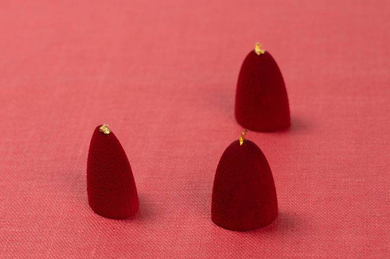 Etwas Kirschgelee in die Form geben. Dann mit der Carma® Couverture White Ivoire 35% Vanille Ganache füllen und 24h festwerden lassen. Die Pralinenform mit vorkristallisierter CARMA® Dark Padera 55% schliessen. Die fertigen Pralinen ca. 5 Minuten auf einem Blech in den Gefrierschrank geben. Mit roter Kakaobutter bei 35°C die Pralinen besprühen um einen Samteffekt zu erhalten. Mit Blattgold verzieren.