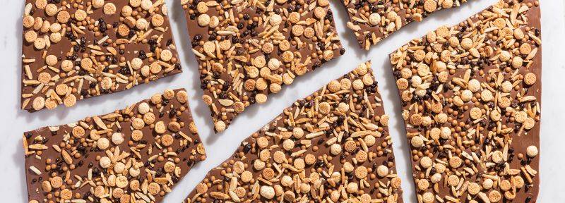 Bruchschokolade ist schnell, einfach und mit geringem Aufwand herzustellen. Viele der Zutaten sind meist in der Backstube vorhanden: ein ideales Handwerksprodukt und perfekt zum Mitnehmen für Ihre Kunden!