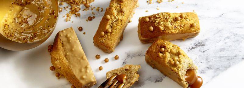 Wenn das Leben ein bisschen mehr Glamour braucht, setzen Sie auf GOLD! Verwöhnen Sie Ihre Kunden mit kleinen nussigen Küchlein , gefüllt mit flüssigem Karamell, überzogen mit der zartschmelzenden GOLD Schokolade und dekoriert mit crunchy Karamell-CrispearlsTM.
