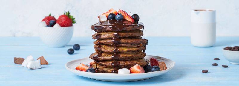 Drizzle the chocolate sauce on pancake stack and serve with fresh fruit
