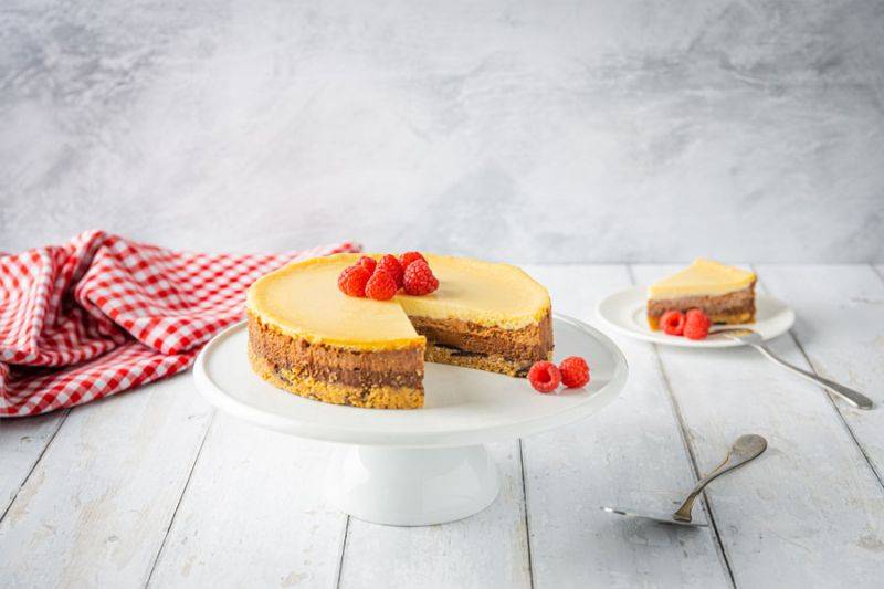 Melt the milk chocolate and mix with one amount of the cheesecake mix. Pour on top of the dark chocolate layer and level the surface.