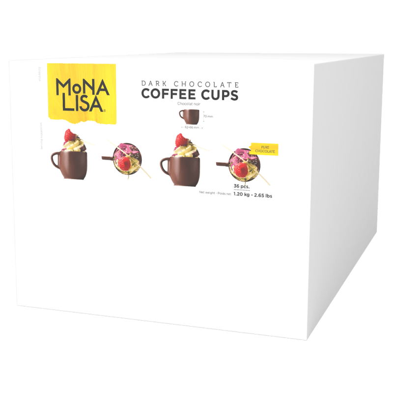 Our small Dark Chocolate Espresso Cups (L: 56, W: 44, H:21mm) are the perfect base to create decadent finger desserts. Their shape is optimal for dark origin chocolate mousses, coffee creams, and tiramisu or praline crèmes for ultimate richness.