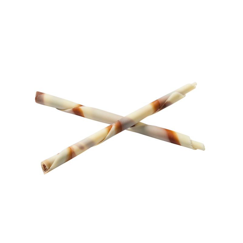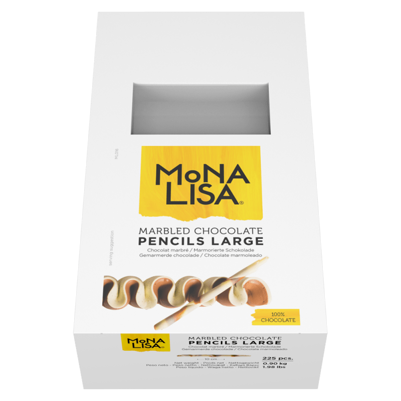 Finely rolled marbled chocolate pencils (D: 7, L: 100mm) to use on plated desserts, cakes and even ice cream. This pencil will bring an elegant chocolate touch.