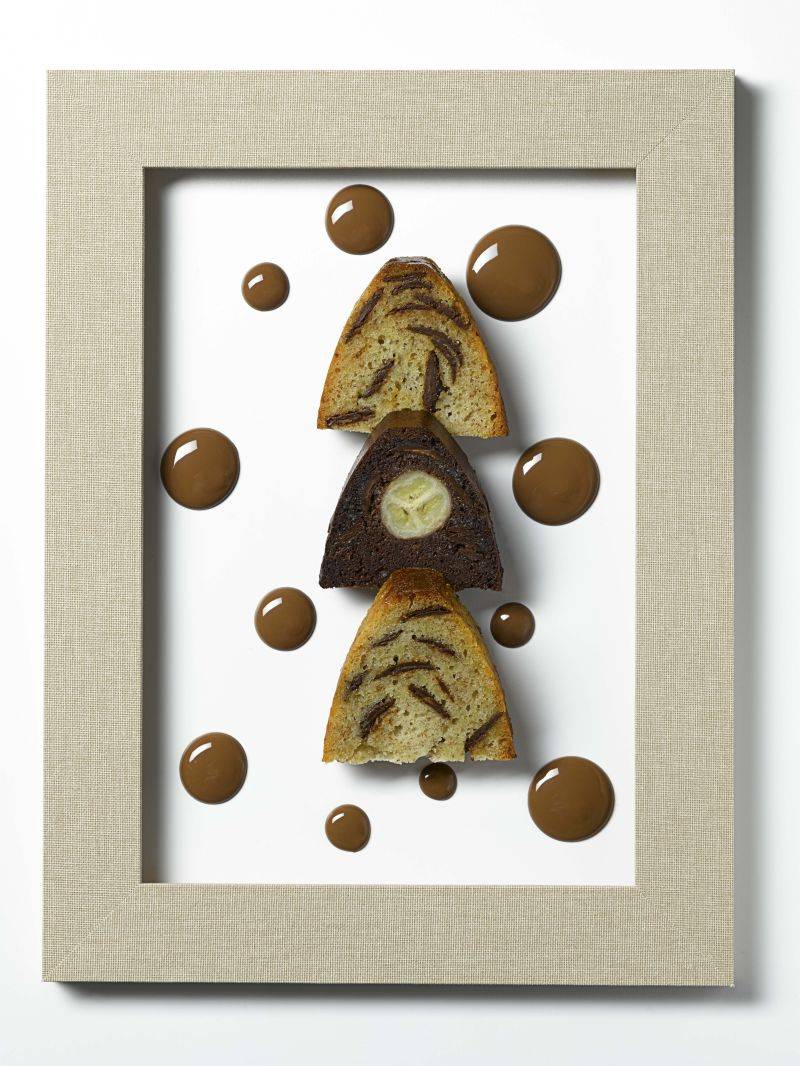 Combine bananas and almond paste well with the first quantity of sugar. Add egg yolk, eggs and melted butter. Beat egg whites with the second quantity of sugar and combine with almond sugar mixture. Add sieved cocoa powder and flour and combine. Fold in chopped Milk Ecuador. Fill three silicone moulds to about half with batter, place one banana on top and fill with remaining batter.