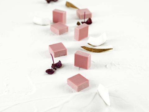 Bring cream, butter, invert sugar and glucose to a boil. Leave to cool to 80°C and pour over couverture solids. Homogenise well with a hand blender and leave to cool to 29°C. Pour the mass between two metal bars to approx. 8 mm. Leave to crystallise overnight and cut with a guitar cutter. Dip into crystallised Dark Madagascar couverture and garnish as desired.