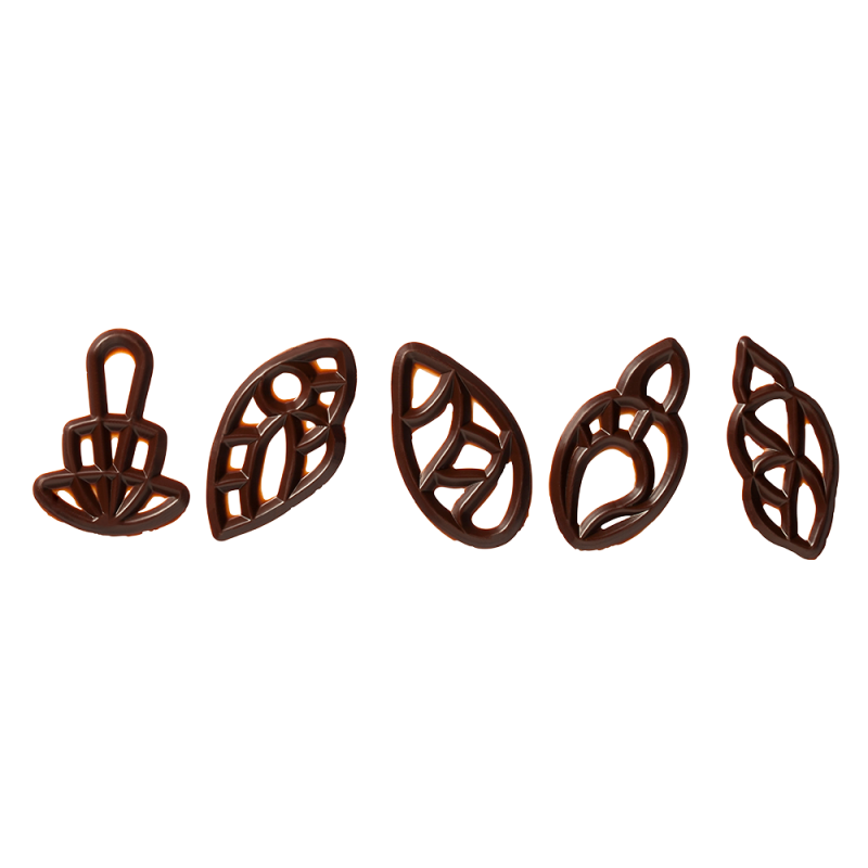 Las 5 decoraciones del surtido Figurolas de chocolate negro (Largo: 45 mm) son finos adornos con un delicado acabado. Estas decoraciones le permitirán construir sus creaciones y añadir nuevas formas. Se pueden utilizar en choux, éclairs y helados.