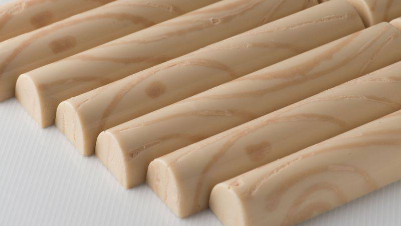 Para el moldeado se necesita chocolate blanco Zéphyr™ + 15% de chocolate con leche Lactée Supérieure (para el patrón de tronco de árbol), chocolate blanco Zéphyr™ + 10% de chocolate con leche Lactée Supérireure (para el patrón de tronco de árbol), chocolate blanco Zéphyr™ + 3% de chocolate con leche Lactée Supérieure (en la parte superior del molde).