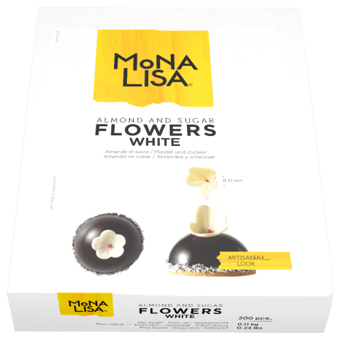 Nos fleurs blanches en amande et sucre (Ø : 22 mm) transforment chaque gâteau en un délice irrésistible. Vous pouvez aussi les utiliser dans vos confiseries pour leur apporter une touche ludique.
