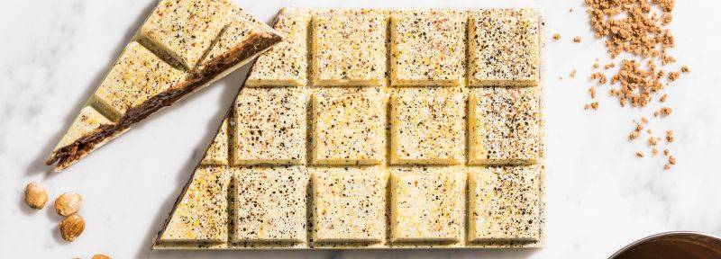 Retirez le moule du réfrigérateur et laissez-le monter à température ambiante. Fermez le tout avec le chocolat au lait cristallisé. Laissez la barre reposer pendant 12 heures et retirez-la du moule.