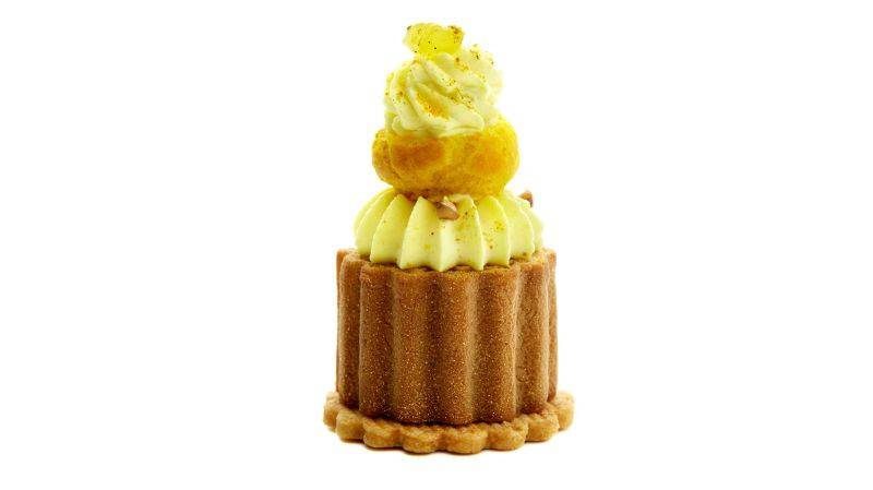 Montare la crema al curry e cioccolato bianco e dressare una rosetta su cui appoggiare un piccolo bignè.