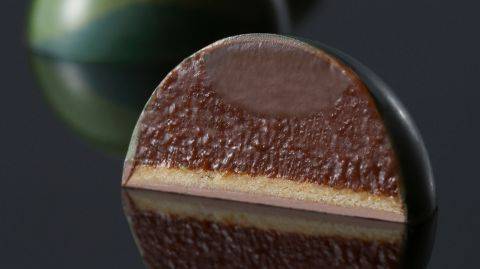 Temperare il cioccolato di copertura al latte Cacao Barry® Lactée Supérieure 38% cacao e stampare le due metà della foglia. Riempire una metà con ganache al frutto della passione e banana Alunga™ e l'altra con pralinato croccante alla nocciola, quindi lasciare cristallizzare a 6°C per 20 minuti.