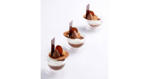 Portare a ebollizione la panna e il latte, aggiungere lo zucchero, la gomma xantana, i tuorli d'uovo ed emulsionare con il mixer. Versare sopra il cioccolato e il pralinato. Lasciar riposare per 5 minuti. Quando il composto raggiunge i 4°C, aggiungere gli albumi ed emulsionare nuovamente per ottenere una crema. Mettere in un sifone e caricare con 3 cariche. Mettere da parte in frigorifero.