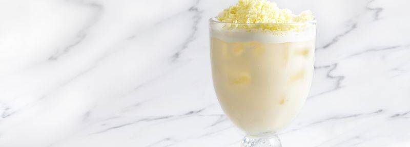 a +-72°C assieme a 2 cucchiai di cioccolato Ground Chocolate Bianco Callebaut®. Guarnire con un cucchiaio di panna di cocco montata.