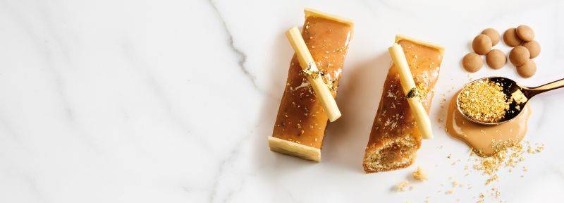 CHW-PS-19831E0-999, spolverare con la polvere metallizzata oro Creative Gold Mona Lisa CLR-19165-999. Bordare con delle placchettine in cioccolato bianco Jura le due estremità del dolce. Guarnire con una penna in cioccolato bianco X-Large Mona Lisa CHW-PC-19939E0-999 e spolverare con Gold Flakes IBC S017602.