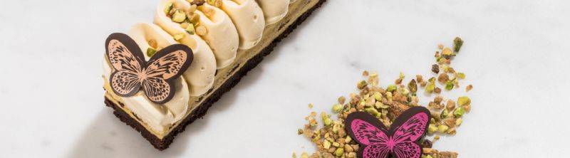 Decoreer met Mona Lisa® Butterflies en Cacao Barry Pistache Bresillienne.