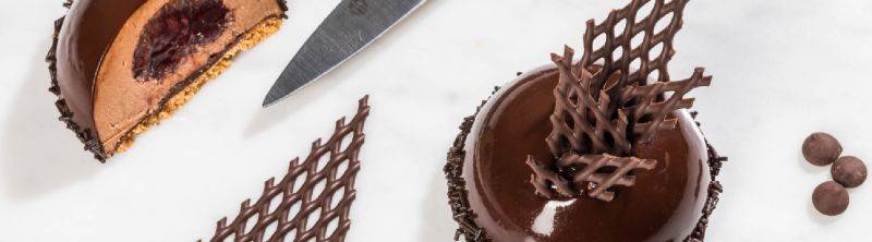 Decoreer met Callebaut®Vermicelli donker en grote Mona Lisa® Rasters donker. Breek het raster in gewenste stukken.