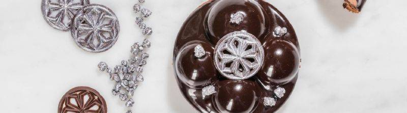 Glaçeer de bevroren tartelettes met zwarte glaçage. Shimmer de Mona Lisa® Galarettes en Mona Lisa® ChocRocks met Mona Lisa® Silver Powder.