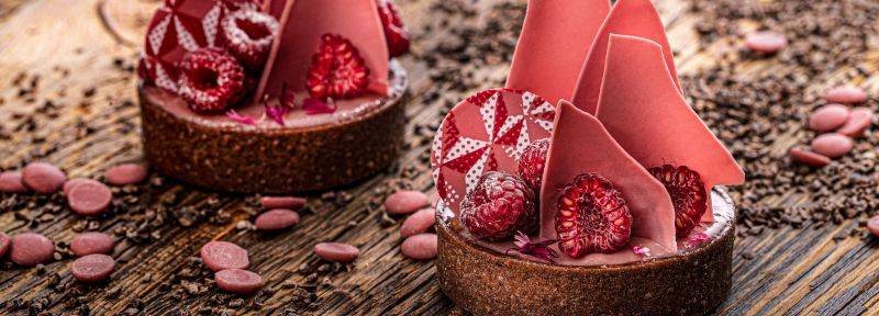 Ranty o średnicy 6 cm i wysokości 2 cm wyłożyć ciastem kruchym, wypiec w temperaturze 160°C ok 15 minut. Na spód wystudzonego podkładu cieniutko wyszprycować ganache z czekolady deserowej (ok. 7 g). Na ganache czekoladowy wyłożyć warstwę feuilletine (ok. 15 g). Na prażynki położyć połówki świeżych malin (ok. 80 g na 7 monoporcji) i zalać to Ganachem z czekolady Ruby. Całość udekorować cienkimi kawałkami zatemperowanej czekolady Ruby, świeżymi malinami i krążkiem z czekolady Ruby z nadrukiem zrobionym przy użyciu transferu Mona Lisa.