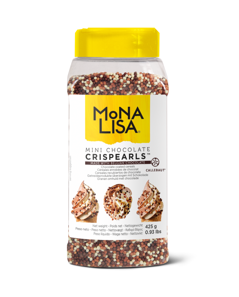 Mini Crispearls ™ são uma mistura divertida de pérolas em miniatura de chocolate amargo, ao leite e branco revestidos em torno de um cereal. O Mini Crispearls ™ vem em uma embalagem prática para você decorar suas receitas. Misturados em mousse de chocolate, sorvete ou bavarois, eles adicionam uma textura crocante de chocolate às suas sobremesas e permanecem sempre crocantes.