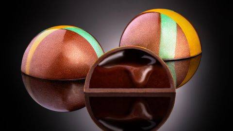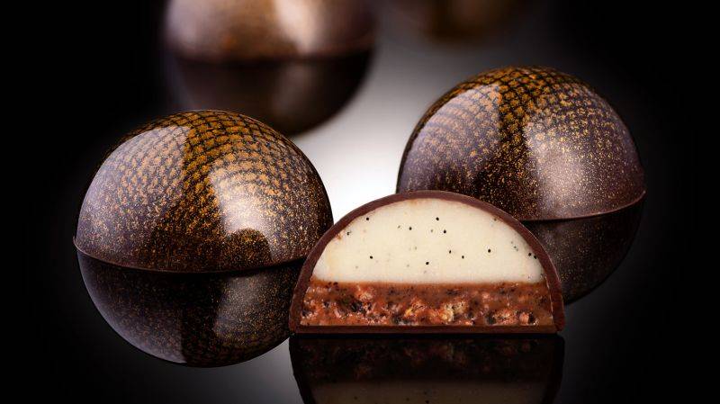 Окрасить форму затемперированным какао маслом золотого и черного цвета. Сформировать капсулы из Fleur de Cao 70% Cacao Barry.