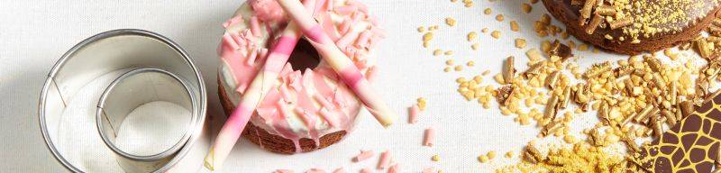 Кондитерским кольцом вырежьте формы пончика из брауни (предпочтительно использовать брауни на большом подносе 40x60 см).