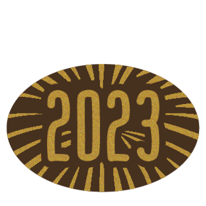 2D Chocolate decoration oval plaque made of dark Belgian chocolate with a yellow "2023" print based on sugar. Product From Natural Origin and free from Titanium Dioxide. This product is light sensitive. Dimensions are 27 x 18mm. Each pack contains 400 pieces. Tip for New Year's Eve.