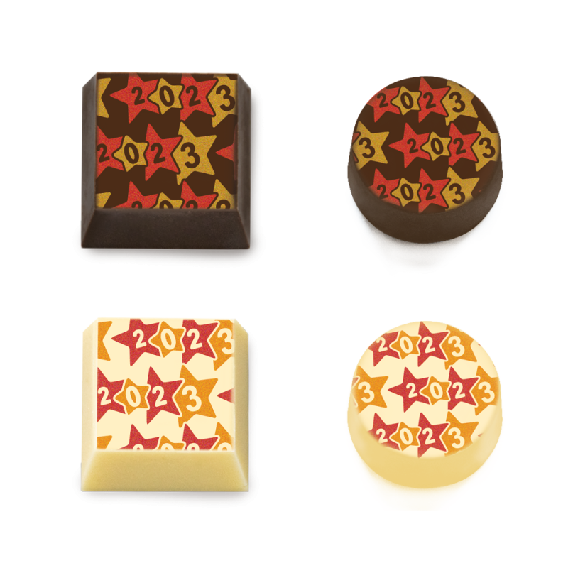2023 transfer sheet with a gold and red "2023" print based on sugar. For printing on chocolate and other confectionery. Product From Natural Origin, free from Titanium Dioxide and suitable for vegans. This product is light sensitive. Dimensions are 300 x 400mm. Each pack contains 30 transfer sheets. Tip for New Year's Eve.