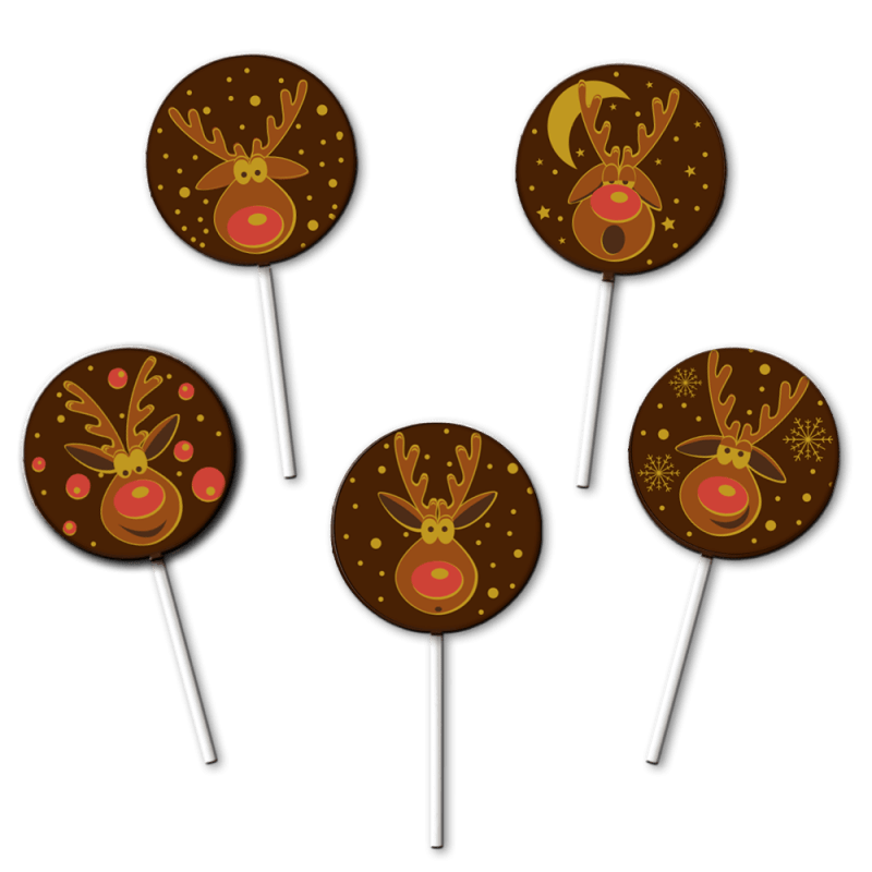 Balin Lollies transfer sheet for making chocolate lollipops with various yellow, red and orange reindeer prints based on sugar. For printing on chocolate lollies and other confectionery. Product From Natural Origin, free from Titanium Dioxide and suitable for vegans. This product is light sensitive and moisture sensitive. The transfer sheets are pre-cut for magnetic lollipop mould F000156, with a dimension of 59 x 59mm. Dimensions of the transfer sheet are 163 x 264mm. Each pack contains 60 transfer sheets (with 5 lollies each). Tip for Christmas.