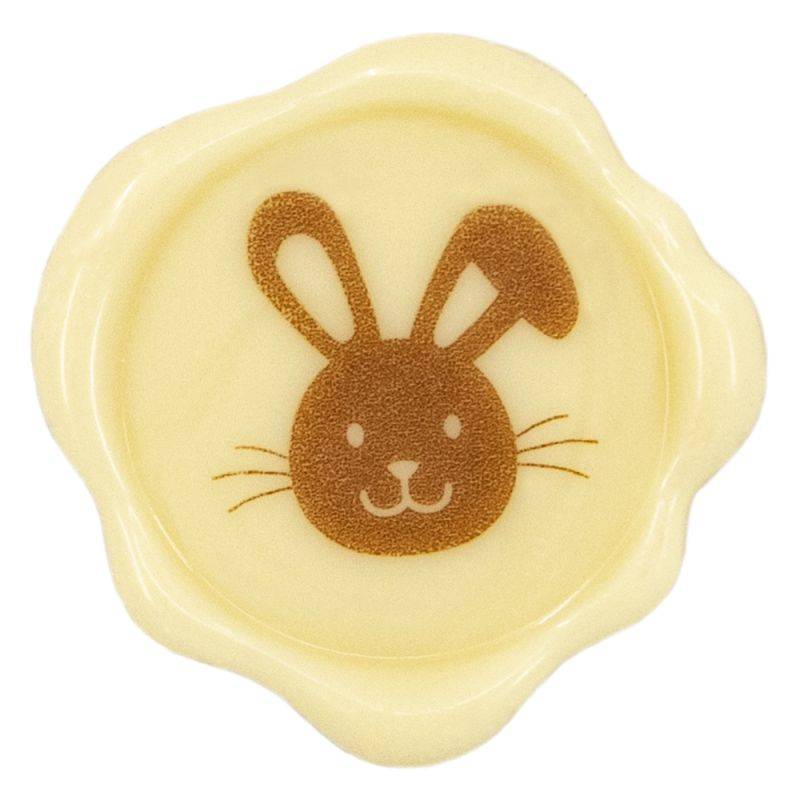 Chocolate decoration, chocolate shape Wax Seal for pastry and desserts. Made of white Belgian chocolate with a brown bunny face print based on colored sugar. Dimensions are 32x32mm. Each pack contains 70 chocolate seals. Tip for Easter.