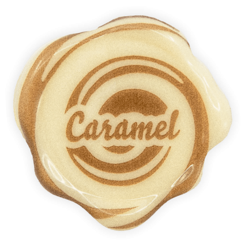 Chocolate decoration, chocolate shape Wax Seal for pastry and desserts. Made of white Belgian chocolate with a brown Cocoart print with swirly lines and "Caramel" based on sugar. Print colors are From Natural Origin and TiO2-free. Dimensions are 32 x 32mm. Each pack contains 70 chocolate seals.