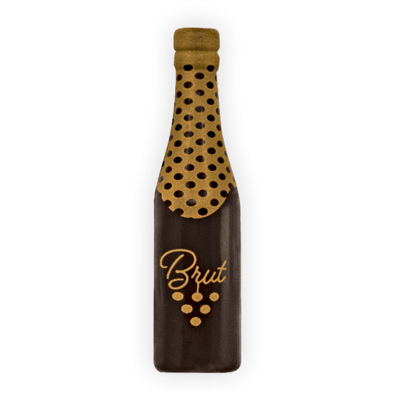 3D Chocolate decoration, chocolate shape bottle made of dark Belgian chocolate with a gold bubbles and "Brut" print based on sugar. Print colors are From Natural Origin and TiO2-free. Dimensions are 80 x 20mm. Each pack contains 24 bottles.