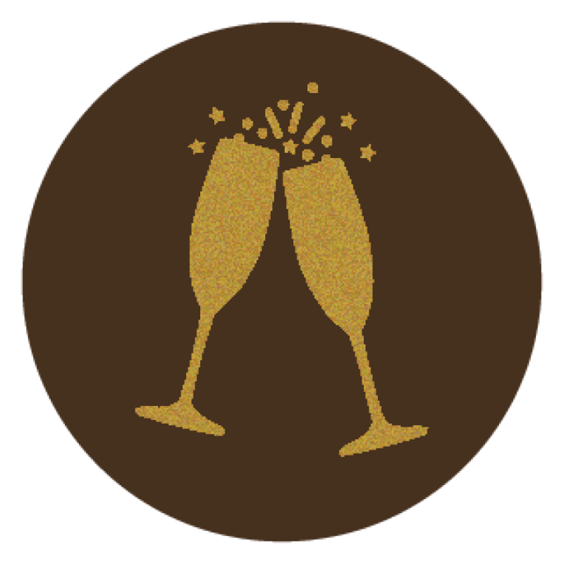 2D Chocolate decoration round plaque made of dark Belgian chocolate with a gold clinking champagne flutes print based on sugar. Product From Natural Origin and free from Titanium Dioxide. This product is light sensitive. Dimensions are 25 x 25mm. Each pack contains 280 plaques.