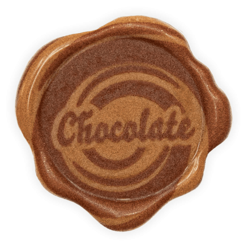 Chocolate decoration, chocolate shape Wax Seal for pastry and desserts. Made of Belgian milk chocolate with a brown Cocoart print with swirly lines and "Chocolate" based on sugar. Print colors are From Natural Origin and TiO2-free. Dimensions are 32 x 32mm. Each pack contains 70 chocolate seals.