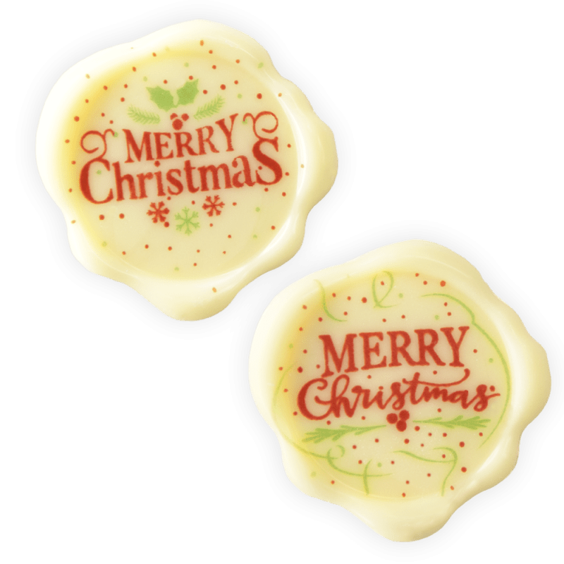 Chocolate decoration, chocolate shape Wax Seal for pastry and desserts. Made of white Belgian chocolate with various red and green "Merry Christmas" print based on sugar. Product From Natural Origin and free from Titanium Dioxide. This product is light sensitive and moisture sensitive. Dimensions are 32 x 32mm. Each pack contains 70 chocolate seals (35 sets). Tip for Christmas.