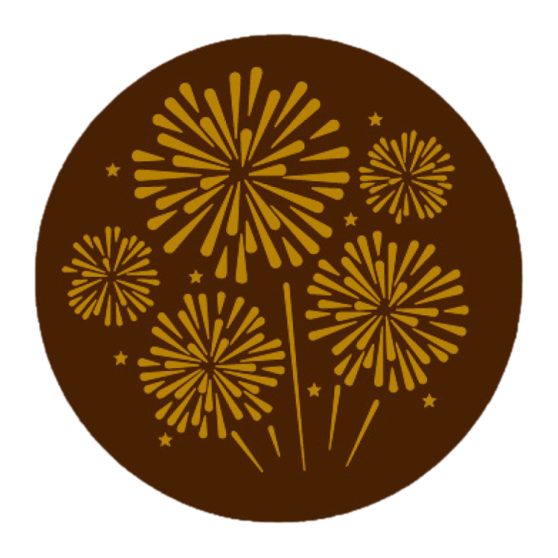 2D Chocolate decoration round plaque made of dark Belgian chocolate with a gold fireworks print based on sugar. Print colors are From Natural Origin and TiO2-free. Dimensions are 25 x 25mm. Each pack contains 280 plaques.