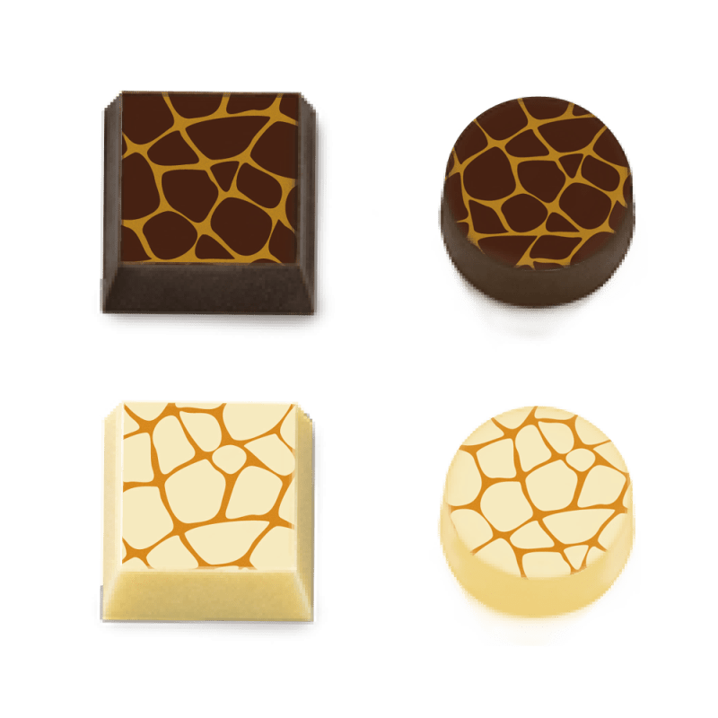 Giraffe transfer sheet with a gold giraffe print based on sugar for chocolate and other confectionery. Printing colors are From Natural Origin and Titanium Dioxide Free. Dimensions are 300 x 400mm. Each pack contains 30 transfer sheets. Also available on rolls for industrial use.