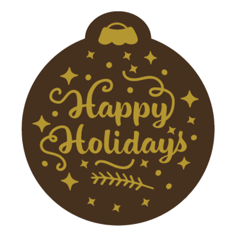 2D Chocolate decoration, chocolate shape Christmas bauble made of dark Belgian chocolate with a gold stars and "Happy Holidays" print based on sugar. Product From Natural Origin and free from Titanium Dioxide. Dimensions are 30 x 27mm. Each pack contains 252 plaques. Tip for Christmas.