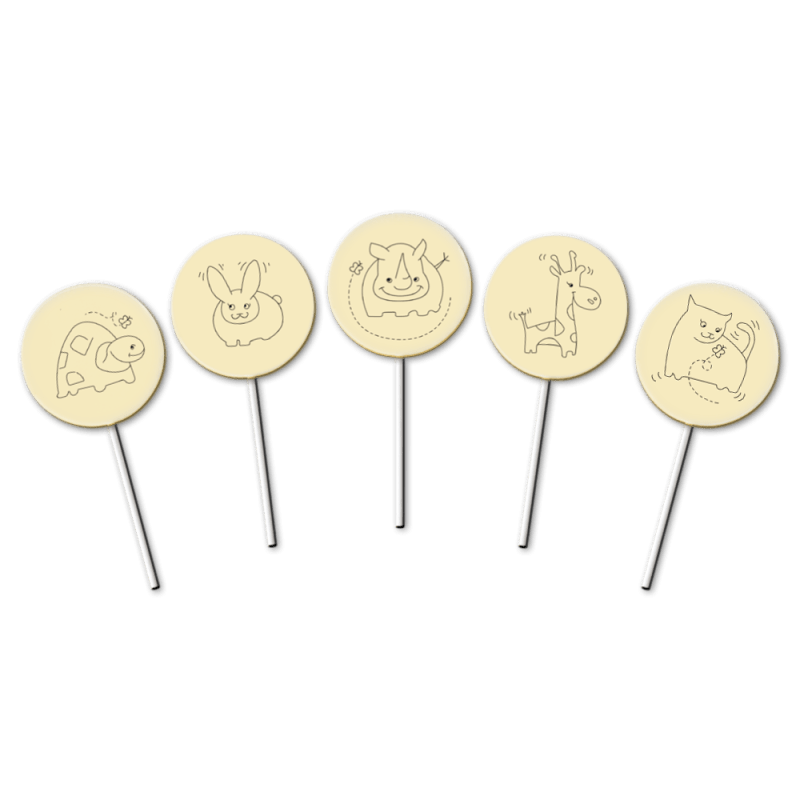 Happy Zoo Lollies transfer sheet for making chocolate lollipops with various animals in black Cocoart print based on sugar for chocolate and other confectionery. Printing colors are From Natural Origin, and Titanium Dioxide-Free and E-Free. The transfer sheets are pre-cut for magnetic lollipop mould F000156. Dimensions are 163 x 264mm. Each pack contains 30 transfer sheets.