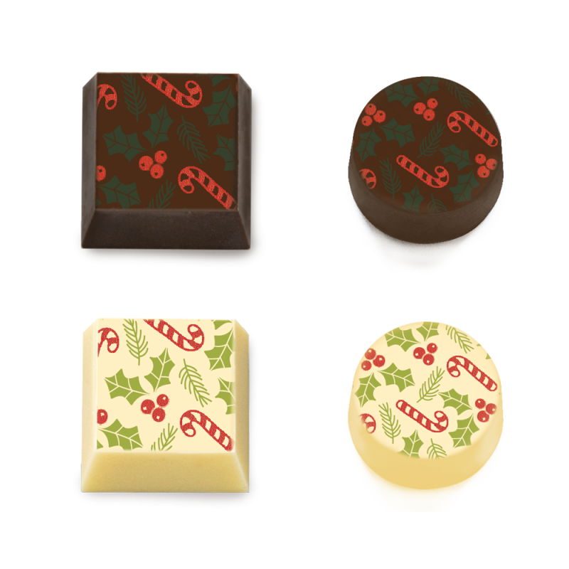 Holly Canes transfer sheet with a green and red sugar cane, pine branches and holly leaves print based on sugar. For printing on chocolate and other confectionery. Product From Natural Origin, free from Titanium Dioxide and suitable for vegans. This product is light sensitive and moisture sensitive. Dimensions are 300 x 400mm. Each pack contains 30 transfer sheets. Tip for Christmas.