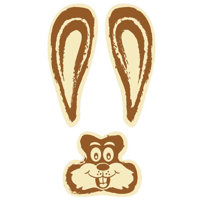 Chocolate decoration, chocolate shape assortment bunny ears and face set made of white Belgian chocolate with brown CocoArt print based on sugar and cocoa powder. Dimensions are 55 x 22mm and 30 x 35mm. Each pack contains 216 pieces (72 sets) Tip for Easter.