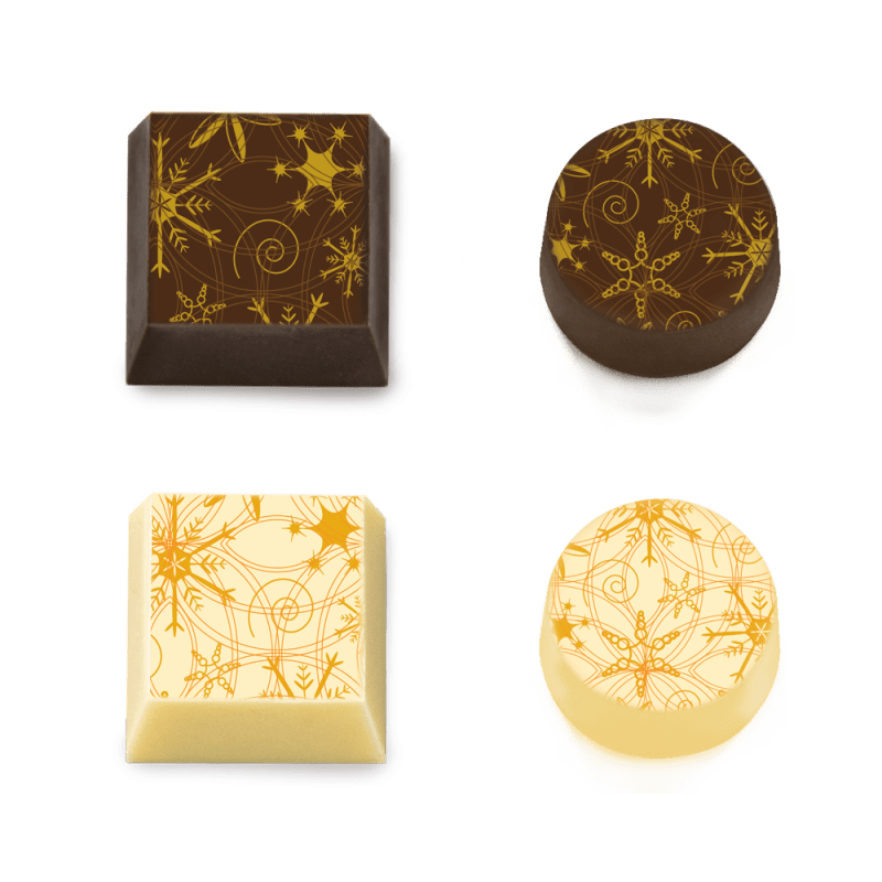 Lucios transfer sheet with a yellow and orange circles and stars print based on sugar for chocolate and other confectionery. Product From Natural Origin, free from Titanium Dioxide and suitable for vegans. This product is light sensitive and moisture sensitive. Dimensions are 300 x 400mm. Each pack contains 30 transfer sheets. Tip for Christmas.