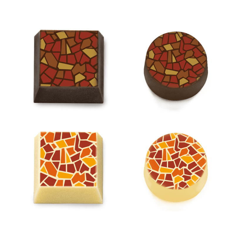 Mosiac transfer sheet with a yellow, red and orange mosiac print based on sugar for chocolate and other confectionery. Printing colors are From Natural Origin and Titanium Dioxide Free. Dimensions are 300 x 400mm. Each pack contains 30 transfer sheets.