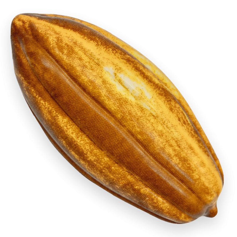 3D Chocolate decoration cup. Natural Cocoa Pod Cup Yellow for desserts, confectionery, pastry and ice cream. Made of white Belgian chocolate, with a Cocoart Yellow print based on sugar. Print colors are From Natural Origin and TiO2-free. Dimensions are 55 x 117mm. Each pack contains 24 halves.