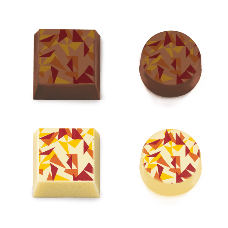 Origami transfer sheet with a yellow, red and orange triangles print based on sugar for chocolate and other confectionery. Printing colors are From Natural Origin and Titanium Dioxide Free. Dimensions are 300 x 400mm. Each pack contains 30 transfer sheets. Also available on rolls for industrial use.