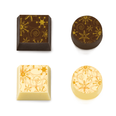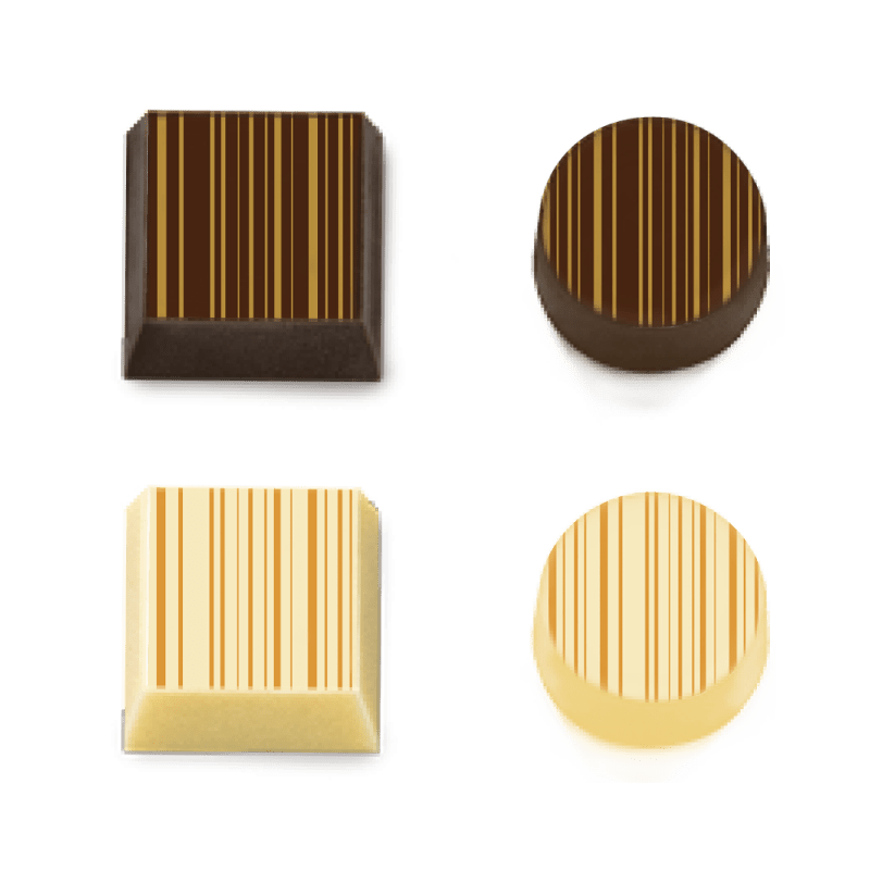 Parallel transfer sheet with a yellow lines print based on sugar for chocolate and other confectionery. Printing colors are From Natural Origin and Titanium Dioxide Free. Dimensions are 300 x 400mm. Each pack contains 30 transfer sheets. Also available on rolls for industrial use.