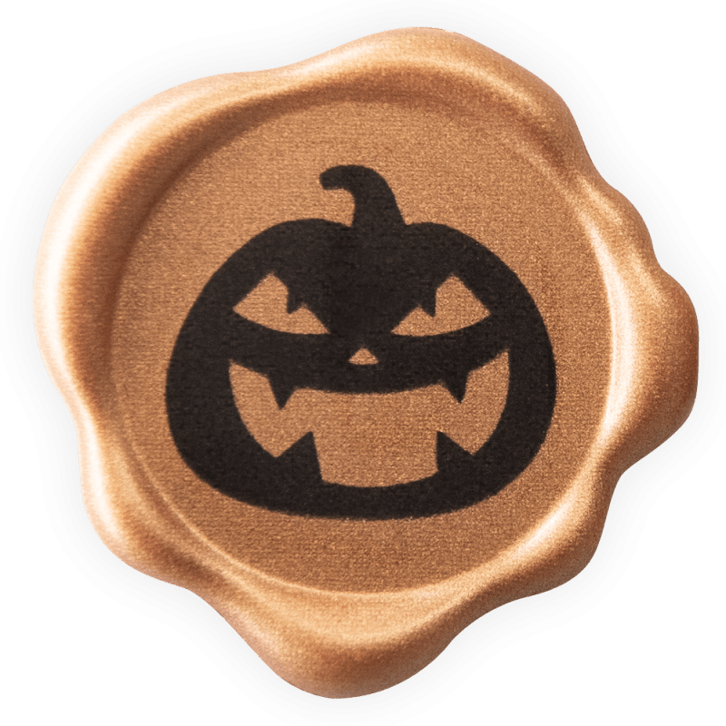Chocolate decoration, chocolate shape Wax Seal for pastry and desserts. Made of white Belgian chocolate with a black pumpkin on a bronze background print based on sugar. Product is From Natural Origin and free from Titanium Dioxide. Dimensions are 32 x 32mm. Each pack contains 70 chocolate seals. Tip for Halloween.