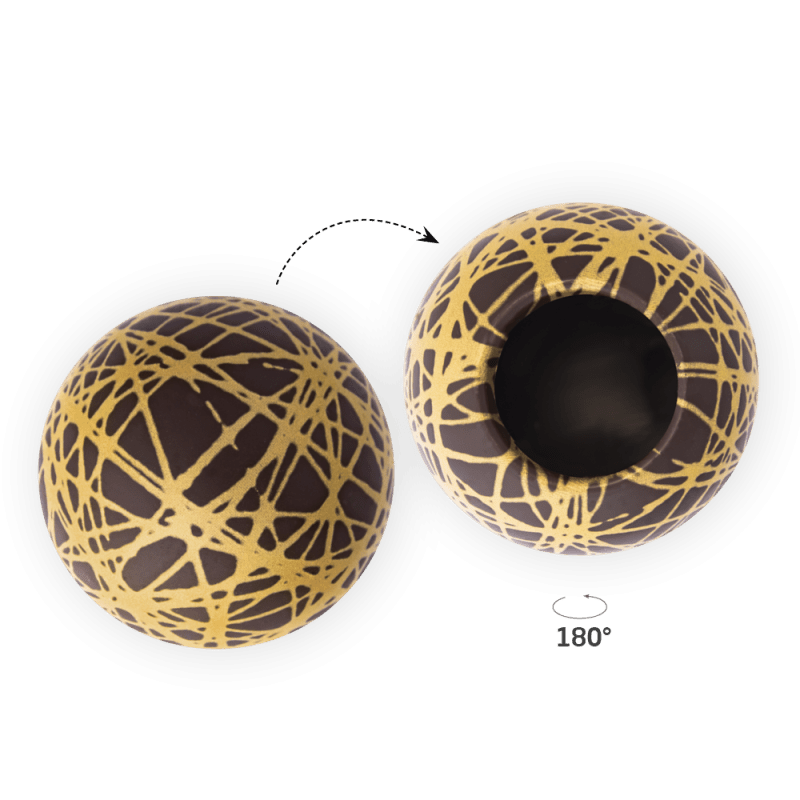 3D Chocolate decoration ball, made of dark Belgian chocolate with a gold and red santa belly print based on sugar. Product From Natural Origin and free from Titanium Dioxide. This product is light sensitive. Dimensions are 25 x 25mm. Each pack contains 63 balls. Tip for Christmas.